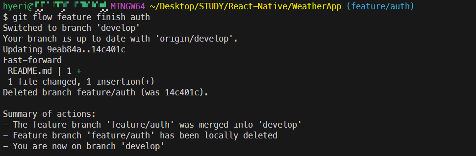 - ์๋์ผ๋ก ์์ ๋ฌผ์ด ๋ฉ์ธ ๋ธ๋์น(develop)์ merge๋๊ณ , ์์ ํ ๋ธ๋์น๊ฐ ์ญ์ ๋์๋ค.